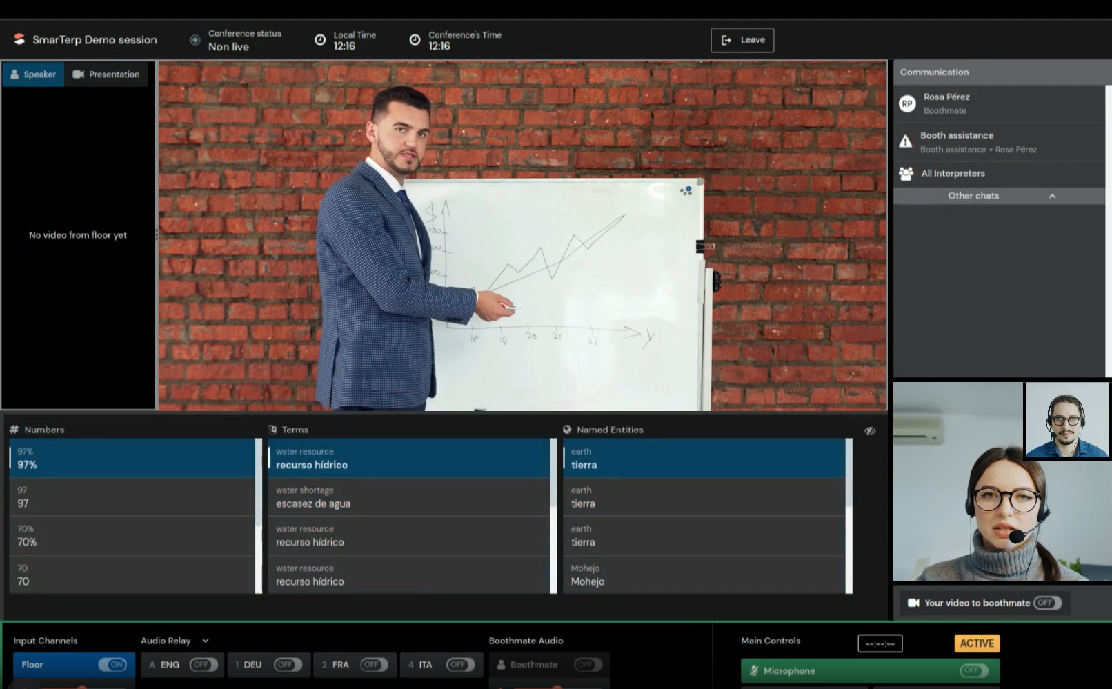Het publiek bevindt zich ofwel samen met de spreker in dezelfde ruimte of is online verbonden. In het laatste geval volgt u de presentatie via de SmarTerp-app. Luisteraars in de zaal horen de vertolking via ter beschikking gestelde koptelefoons of via de oordopjes van hun smartphone. Hetzelfde geldt voor deelnemers die online zijn verbonden en afhankelijk zijn van simultaantolken. Elke deelnemer kiest de gewenste taal in de SmarTerp-app.